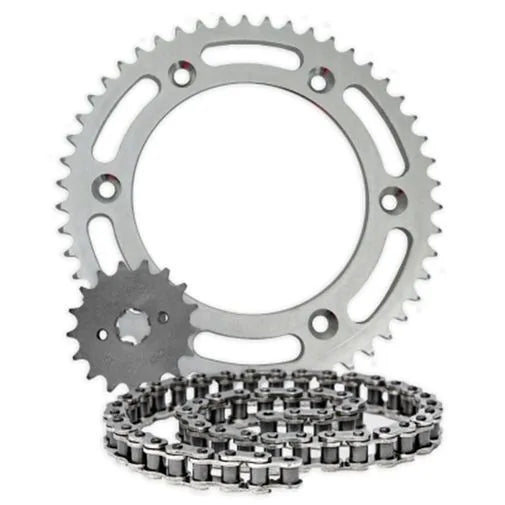 Componentes: Kit completo contendo 1 Coroa, 1 Pinhão e 1 Corrente.