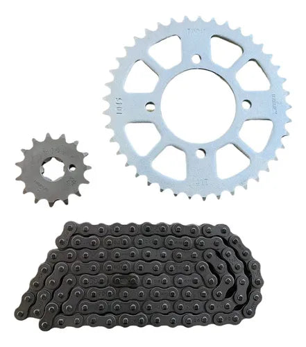 Componentes: Kit completo contendo 1 Coroa, 1 Pinhão e 1 Corrente.