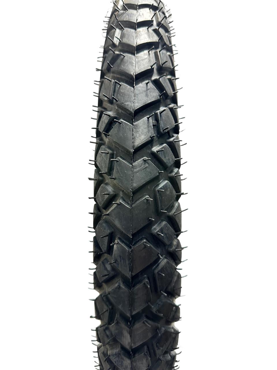 Design da Banda de Rodagem: Cravos estrategicamente posicionados que oferecem excelente aderência e controle direcional em terrenos de baixa aderência, como terra e cascalho.