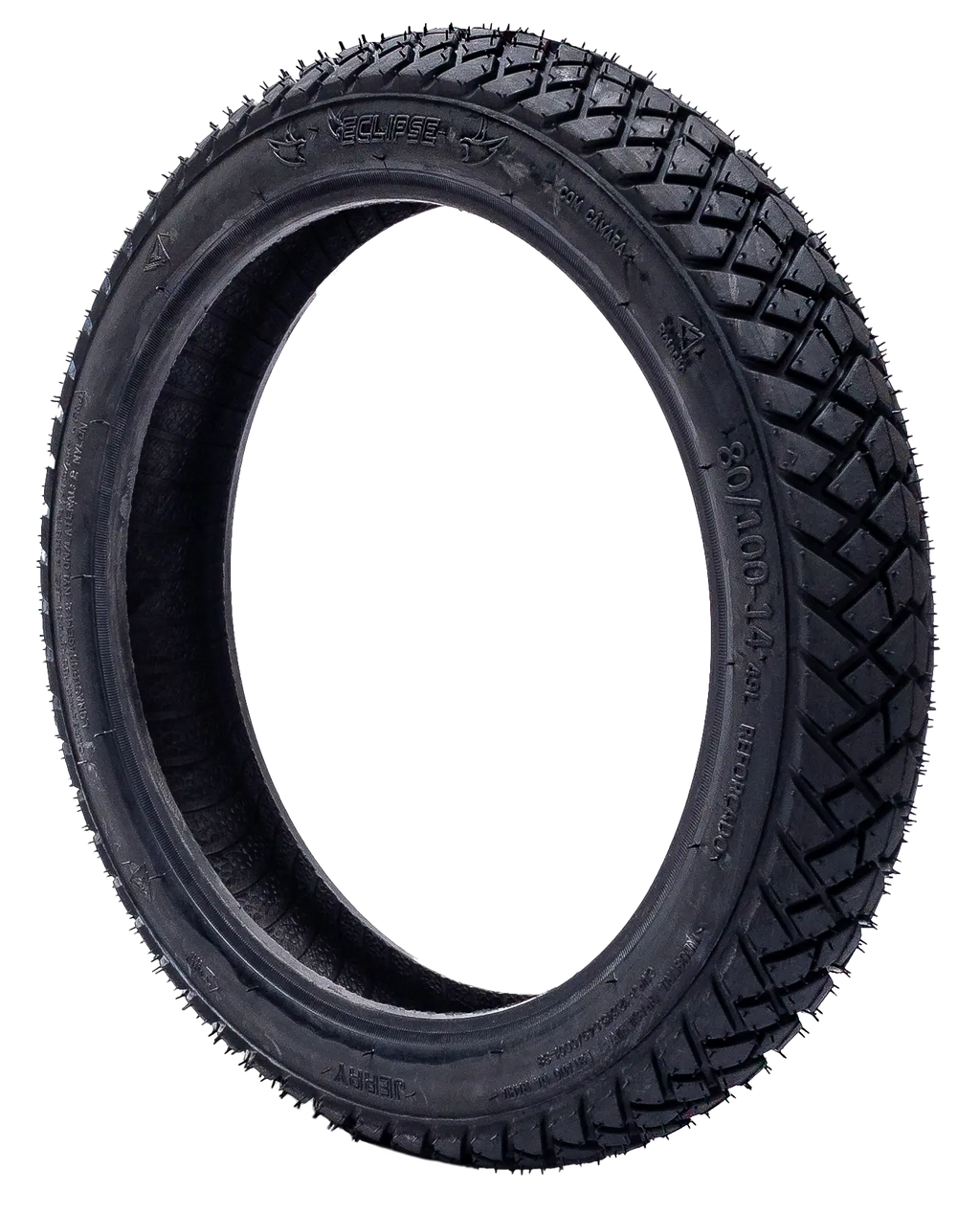 Descrição Geral: Pneu traseiro da marca Jerry, modelo Eclipse, desenvolvido especialmente para as motocicletas CUB (Biz e Pop) que são as campeãs de venda e rodam por todo o Brasil.